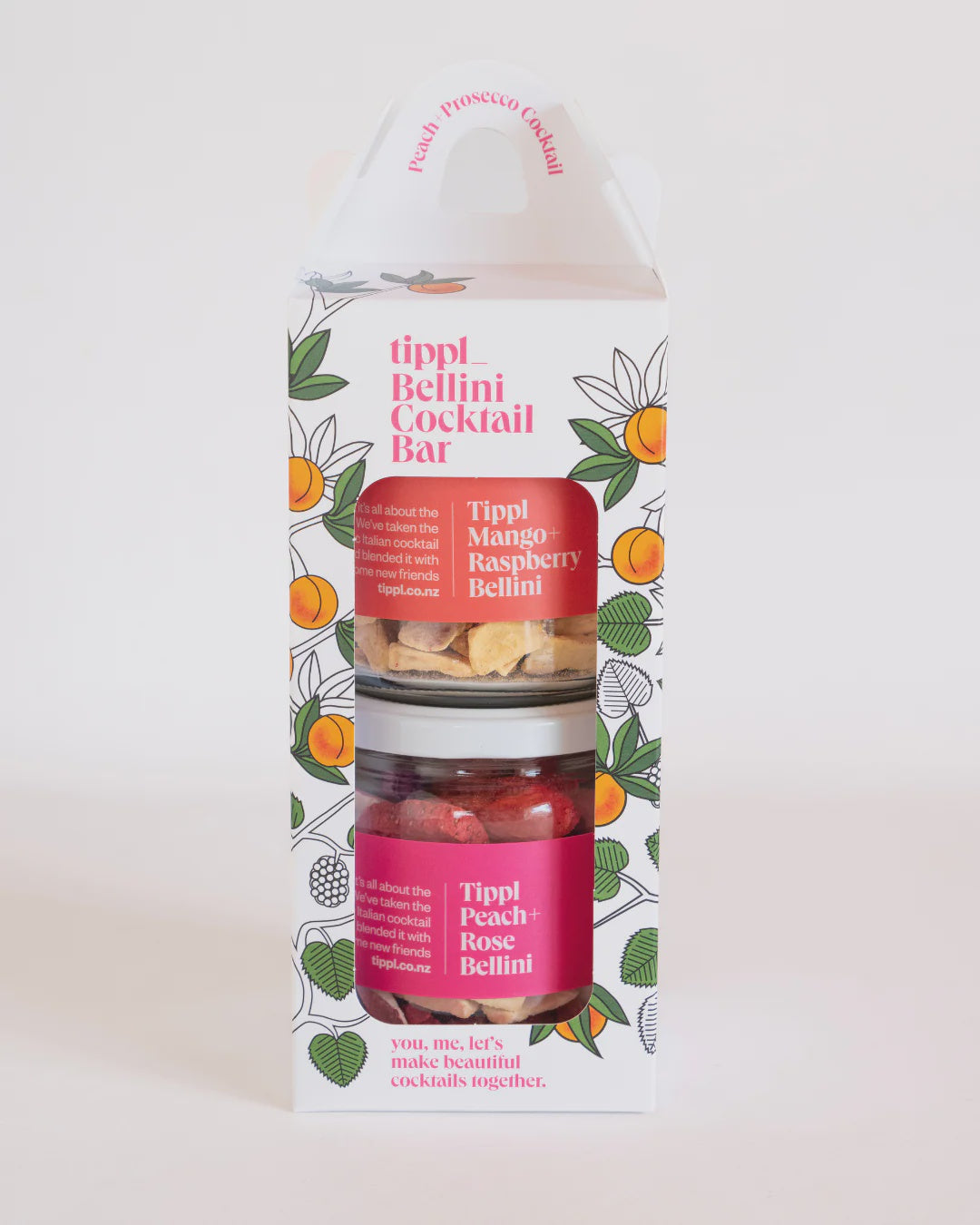 Two 400ml cocktail infusions presented in a schnazzy hand illustrated gift carton; 'white peach & rose bellini' and 'mango & raspberry bellini'. All you need to do is make up your infusion using boiled water then once it's ready, add prosecco or soda to make golden, juicy summeriness in a glass, or a jug if you feel like sharing.
